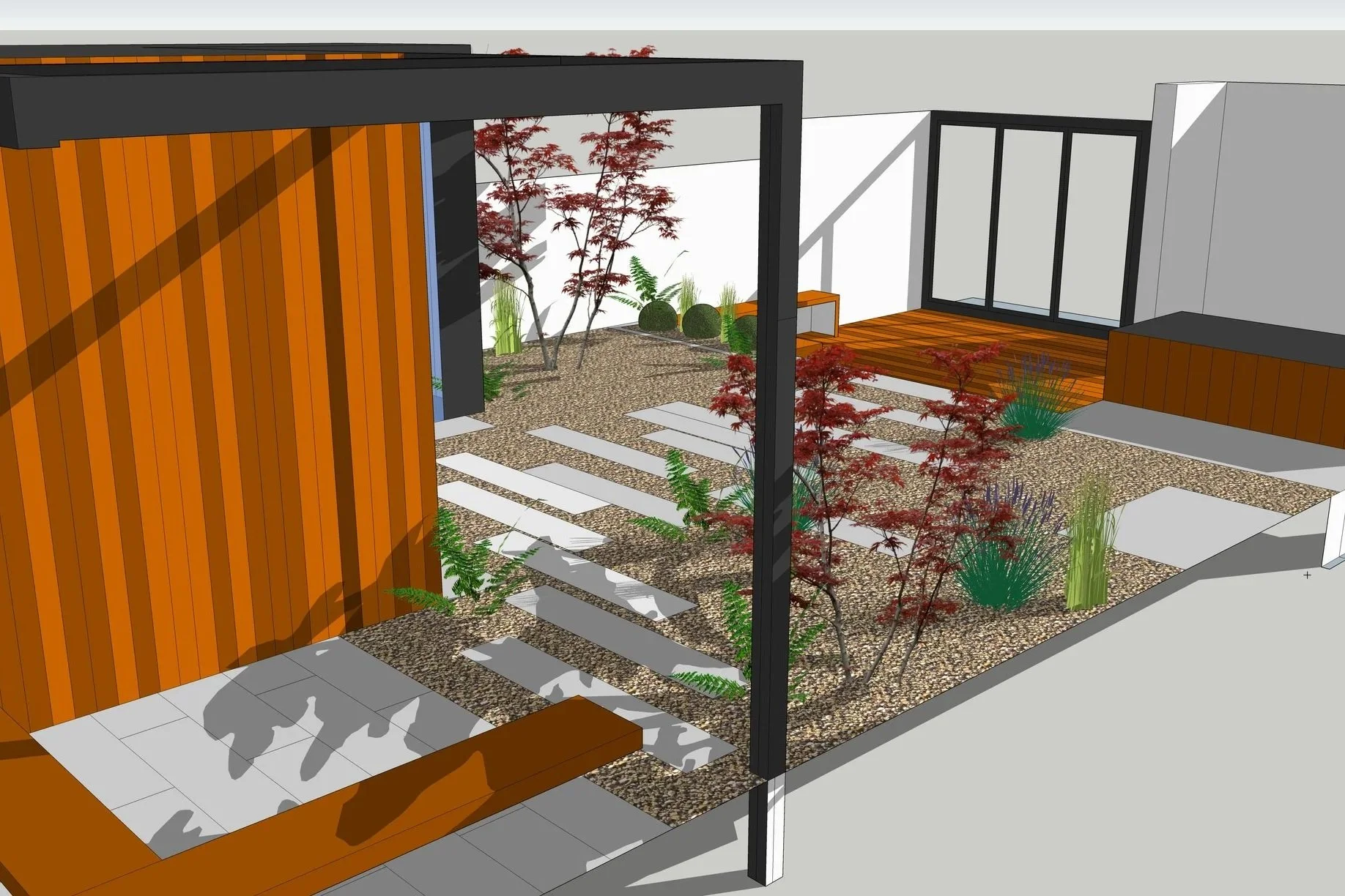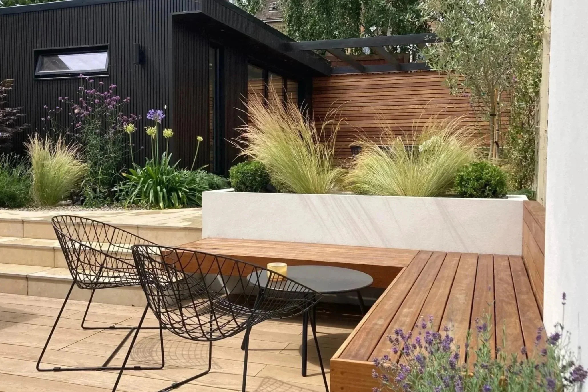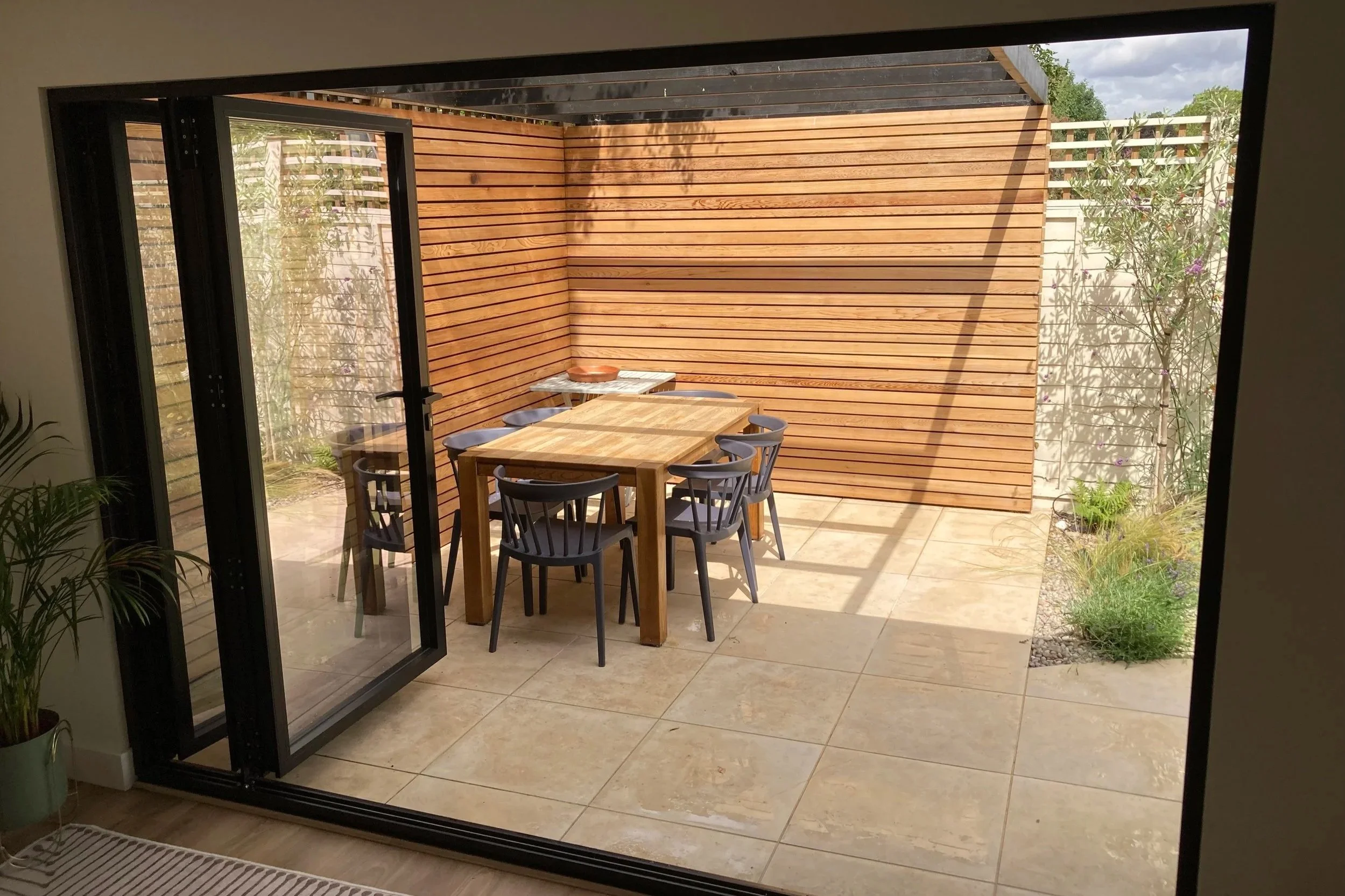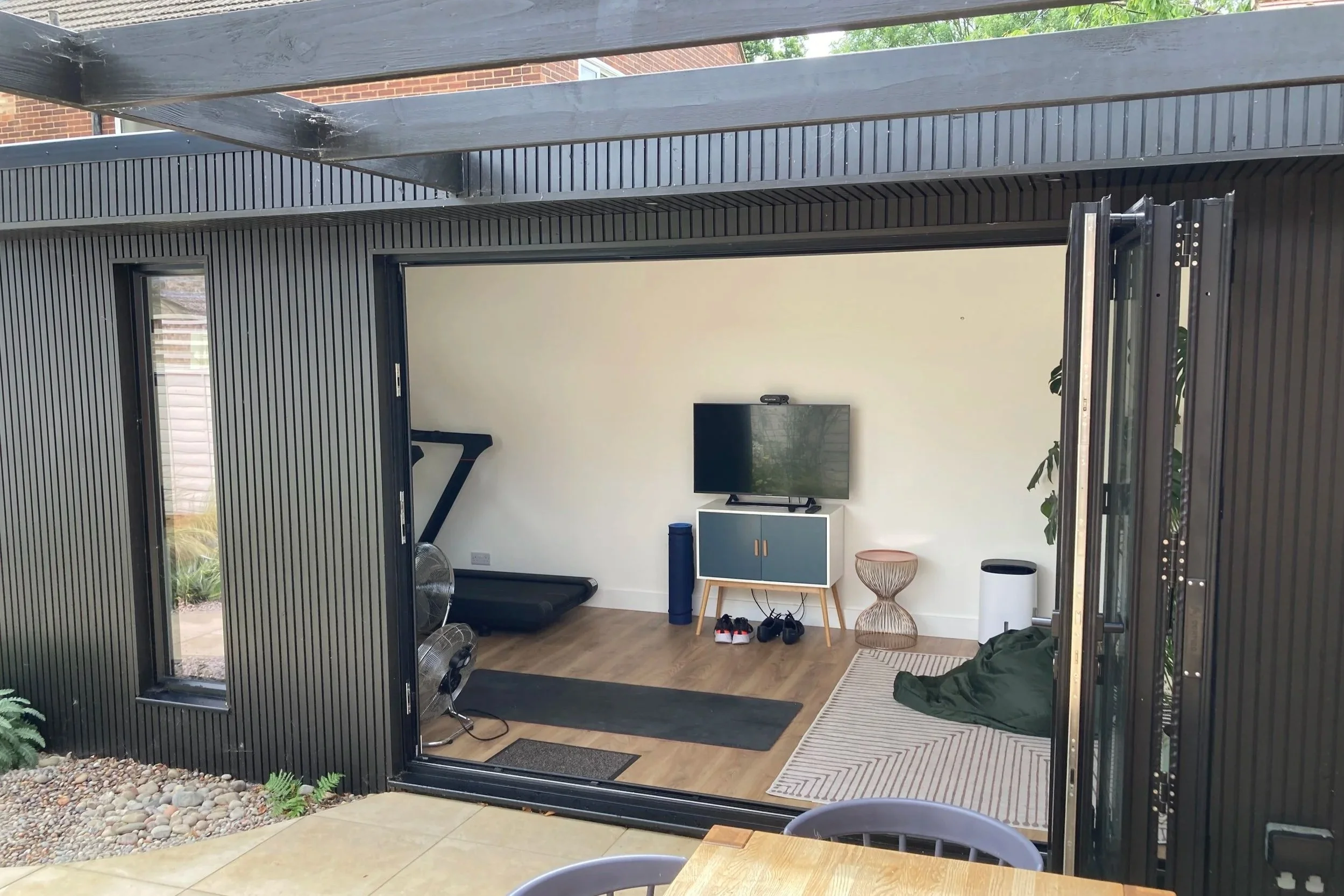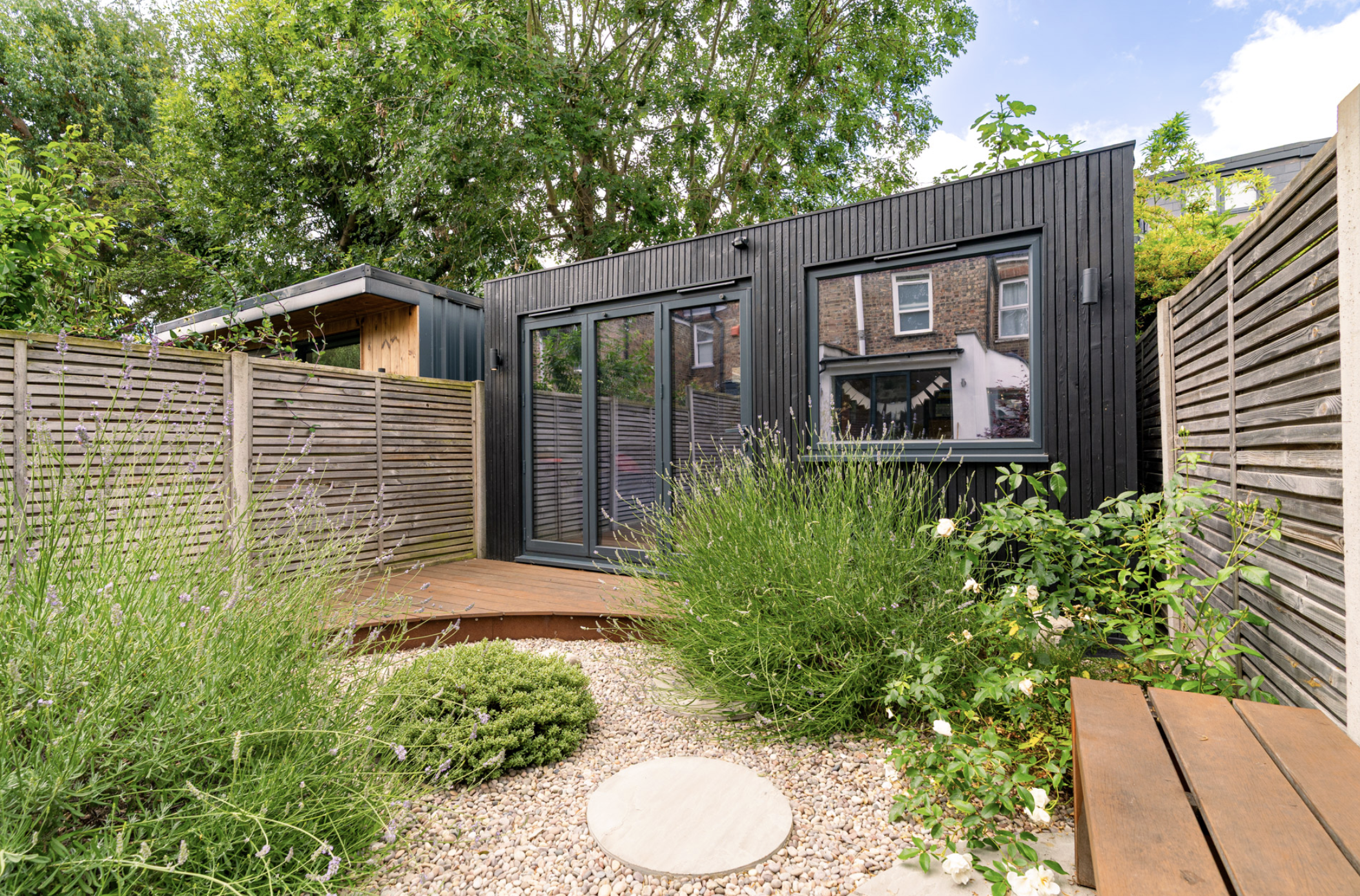 Seamless indoor-outdoor living. The brushed black timber cladding gives the studio a sleek, contemporary look that harmonizes with its garden setting.